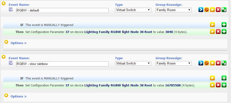 I have an Aeotec RGB Led bulb which can set multi-color transition effect and single color by parametter only and an Aeotec siren have multi alarm sound which can only be set by parameter. For example: If my garage door is open then the led at my bed room will show rainbow effect and other door or event will have other color. With the siren, I want the siren sound will have differnt sound as my choice for different condition/location.