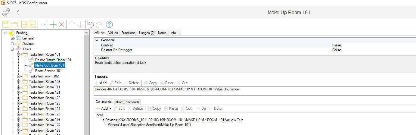 Hello, what I need to do is to create for a Hotel 3 buttons for each room. One for Do not disturb , one for Make Up my Room and one for Room Service. I have allready created the tasks. and connected in each room. These messages will appers in Reception's central P.C. which will running bOS client. When reception see the message for each room will have the possibility to send fixed answers to each room and a confirmation that received the customer's message . I forgot to say that each room will have an Android Tablet to send the commands to the system. Is it possible to make something like this? Also inside the room we have install 3 push buttons that customer can press and select one of the 3 choices above.