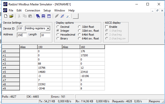 Settings for the w.water meter, register address should be 130 or 150, but it gives constant 0 for value, with 149 I get a response 16,017 but it's the wrong value.
