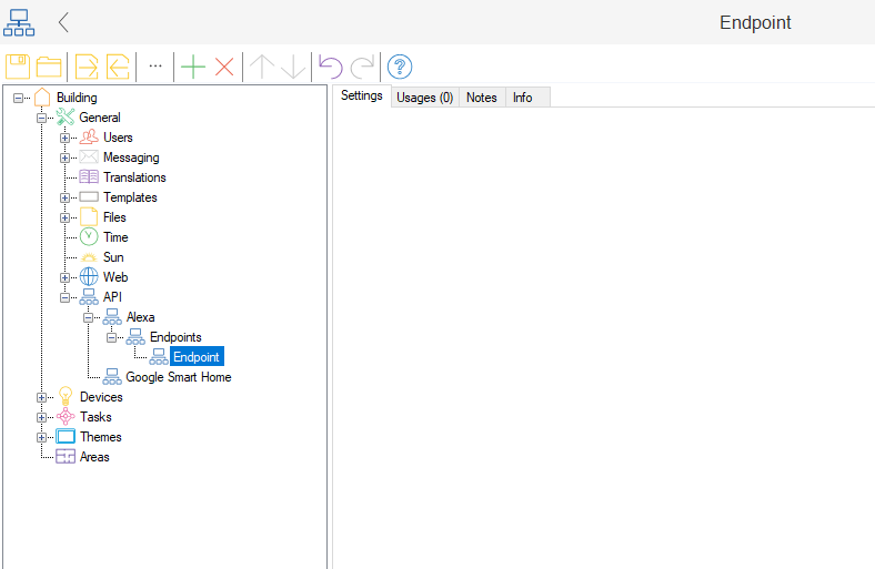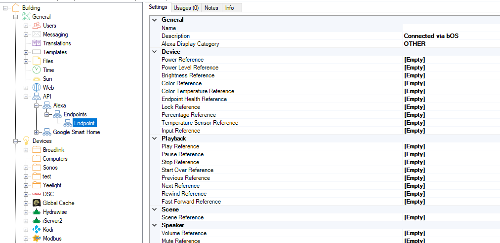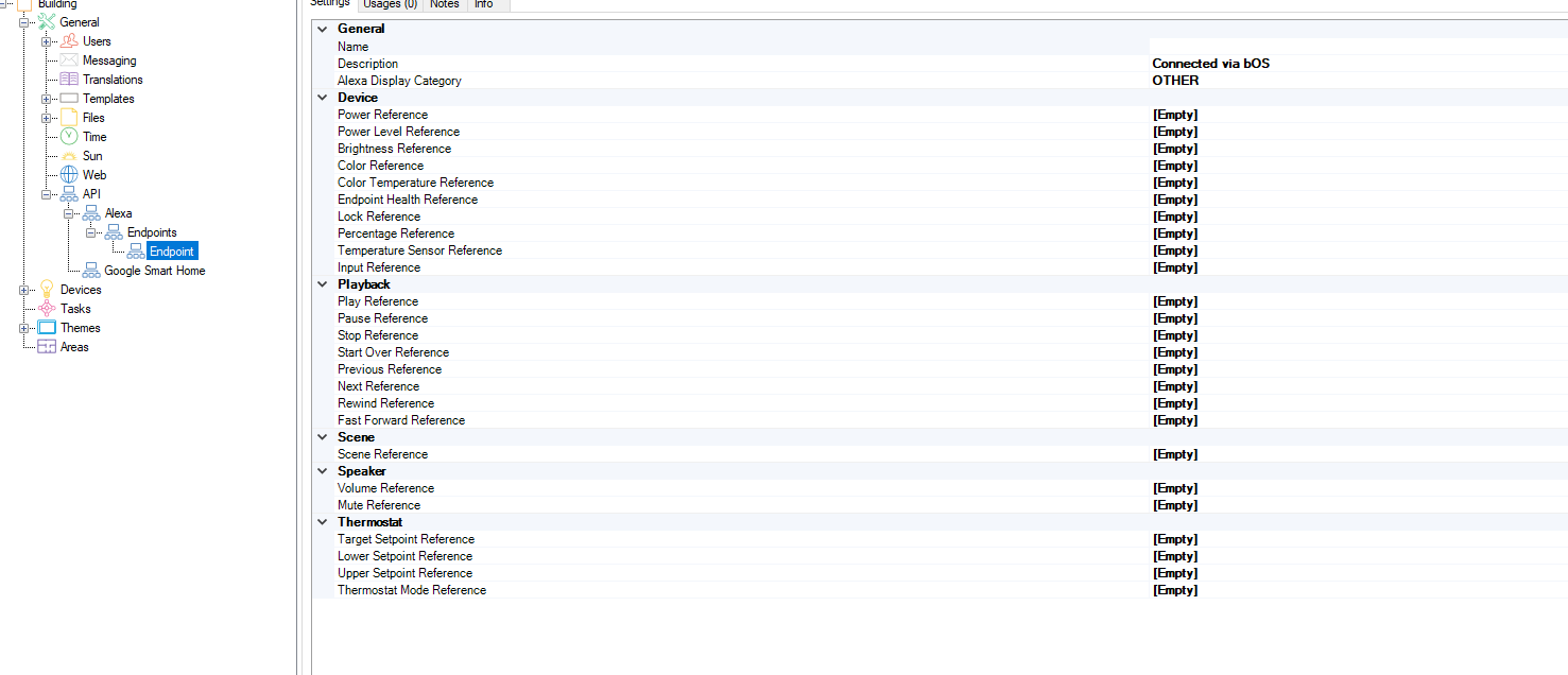 I have the same problem. When I define an endpoint for Alexa the settings tab is empty (no parameters to set)Alexa problem.jpg