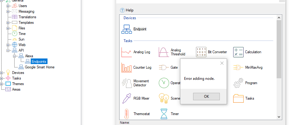 try closing the configurator and going to your bOS configurator installation folder (default path: C:\Program Files (x86)\ComfortClick\bOS Config) and remove the BOSAlexa.dll file. Then try connecting to the server again and re-download the .dll from the server. Also try removing the Endpoints when reconnecting to the server.