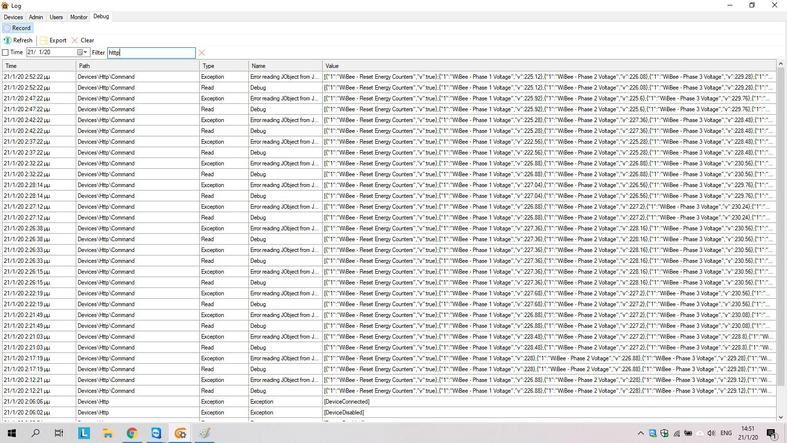 Debug : 20/1/20 6:37:20 μμ : Devices\GetEnergyMeterData\FetchDataFromLM : Exception : Error reading JObject from JsonReader. Current JsonReader item is not an object: StartArray. Path '', line 1, position 1. ...