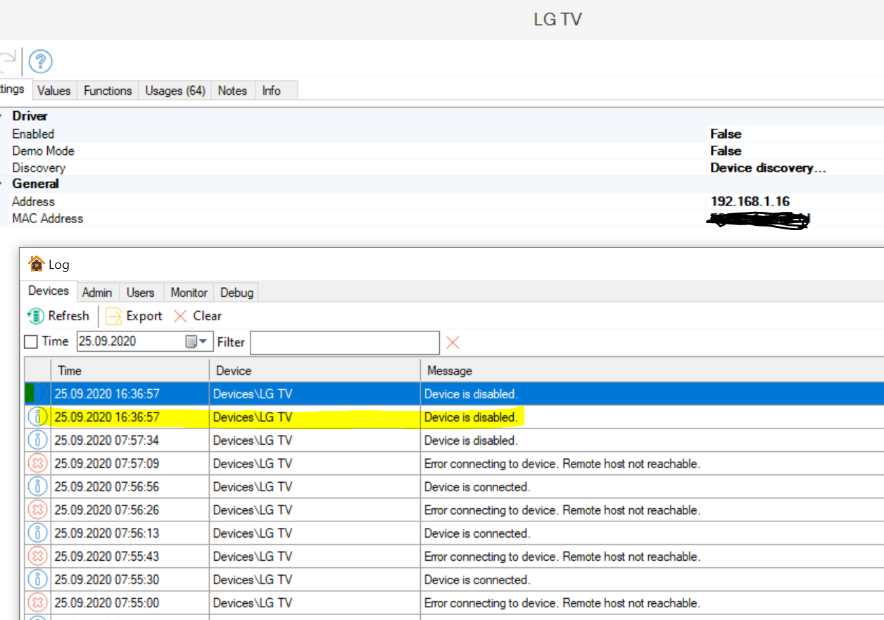 I've noticed two weird bugs again. When the LG device/driver is disconnected, Alexa is still able to turn the TV on. Yesterday i had problem that my tv would randomly turn back on after 30 sec when i turned it Off from the remote, after that i disabled LG device/driver from bOS i was able to turn the tv off again and it stayed like that. But alexa still could turn it On even though it shouldn't be able to connect to it.