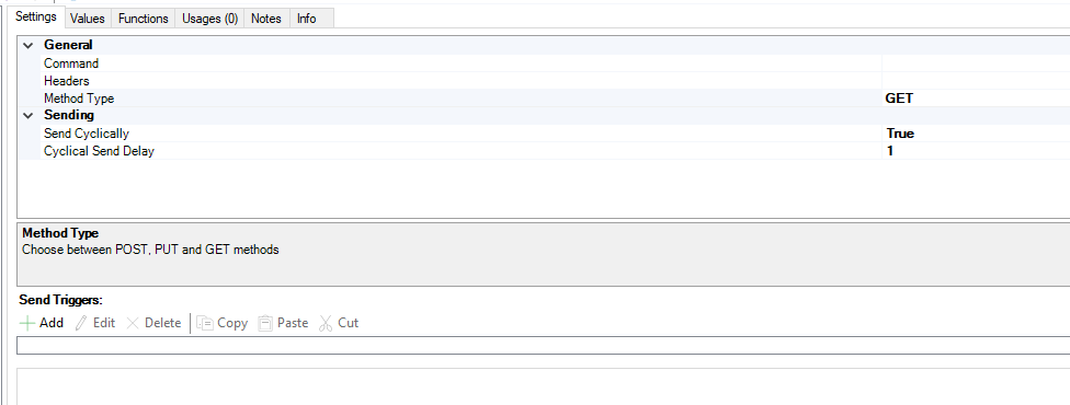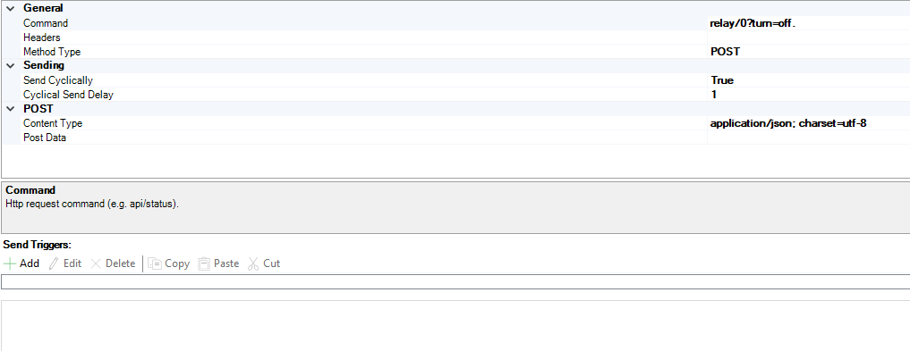 For post commands, you need to set the "Send Cyclically" to false, otherwise, as in the picture tells me, you're sending the off command every 1 second. You can use that for the status, but it's not recommended for the post command in this case, as you just want to send the value once.