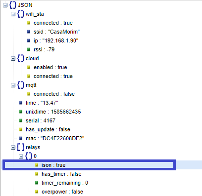 {"wifi_sta":{"connected":true,"ssid":"CasaMorim","ip":"192.168.1.90","rssi":-77},"cloud":{"enabled":true,"connected":true},"mqtt":{"connected":false},"time":"13:48","unixtime":1585662523,"serial":4169,"has_update":false,"mac":"DC4F22608DF2","relays" :[{"ison":false, "has_timer":false, "timer_remaining":0, "overpower":false}],"meters":[{"power":0.00,"is_valid":true,"timestamp":1585662523,"counters":[0.000, 0.000, 0.000],"total":0}],"inputs":[{"input":1}],"ext_sensors":{},"ext_temperature":{},"ext_humidity":{},"temperature":33.67,"overtemperature":false,"tmp":{"tC":33.67,"tF":92.61, "is_valid":"true"},"update":{"status":"idle","has_update":false,"new_version":"20200312-124223/v1.6.1@112262fd","old_version":"20200312-124223/v1.6.1@112262fd"},"ram_total":50328,"ram_free":33856,"fs_size":233681,"fs_free":153361,"uptime":258235}