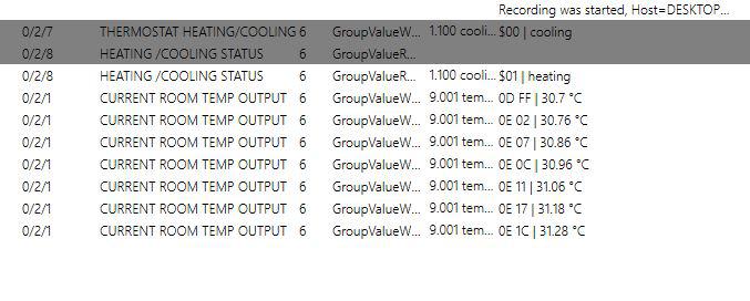 Hi to everyone I am trying to make a room KNX thermostat visualization by using bOS. What I need to do is to control a fancoil and an underfloor heating /cooling valve as main system . First I want to have On/Off for the system. Second I need to turn the fan coil fans speed to automatic , and to manual mode if needed. Also If the the fan mode is to manual I want to control this in steps like fan 1 , fan 2, and fan 3 and back again to 0. Another thing I want to see every time the room's temperature. Also I want of course to change the setpoint of the room thermostat. From the visualization program I want to have Heating / Cooling to be changed (I noticed when I am changing the status from ETS from Cooling to heating mode the icon is changing the opposite I don't know why is this happening). I forgot to mentioned that when the setpoint is changing I want also the setpointing temperature changes to appear of course in the visualization program. Also I want o have the valve of the underfloor heating/cooling to be turn On or Off when the appropriate temperature is set (and see the status of course ) . Last but not least is the 3 modes I Comfort , Away , Night that I want to insert it to the visualization program.  I tried to insert at the beginning  the Room's temperature and it doesn't show me the correct number. Should I have to change it to another format or sometthing?