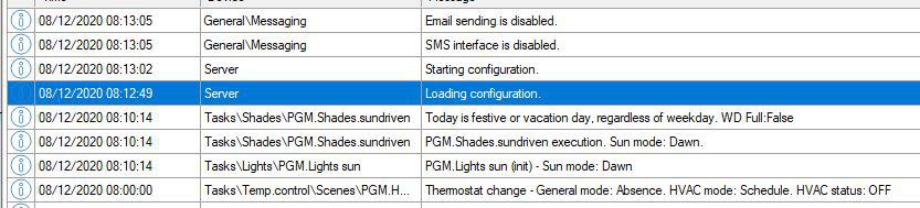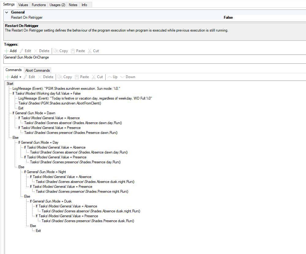 When the exit function is used in a programme, bOS makes de KNX to restart completely, the only thing that should happen is for the programme logic to finish, however KNX is restarted. It took me some time to find out this, to the point that I had to put traces so that when the building and KNX were connected a trace would be logged.