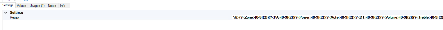 The REGEX listener I have created is for a string (it has been validated as it works in any regex tester) ^\#>(?[0-9]{2})(?[0-9]{2})(?[0-9]{2})(?[0-9]{2})(?[0-9]{2})(?[0-9]{2})(?[0-9]{2})(?[0-9]{2})(?[0-9]{2})(?[0-9]{2})(?[0-9]{2})$/gm