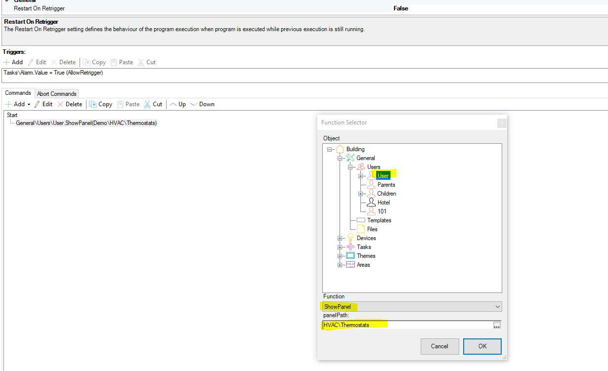 Simply select the fire alarm as trigger, then add Run function, select which user will display the panel, and select ShowPanel and panel should be displayed when alarm is triggered (image attached)