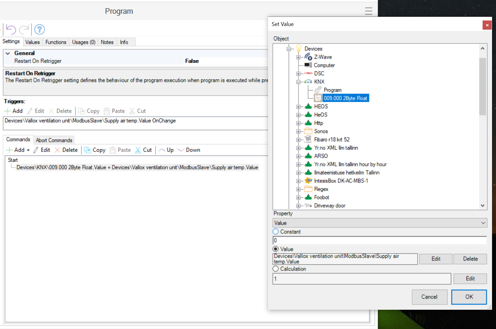 Then under commands add new Set Value. Where the KNX group address you select will receive the same temp change that will trigger the program.