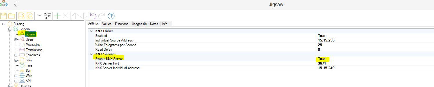 in order to program your devices in ETS trough Jigsaw, you need to enable KNX server in the Jigsaw node under your General (see image attached).