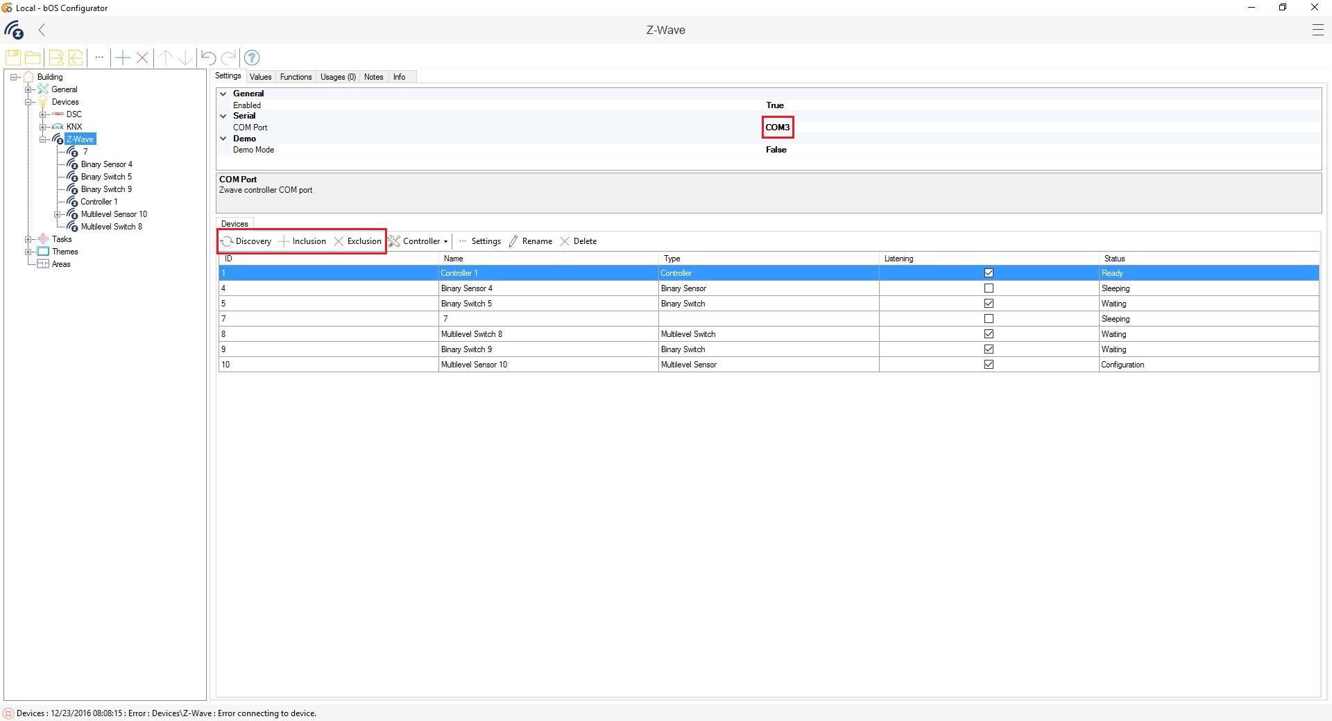 to add and configure your Z-wave devices, first make sure orrect COM port is selected, use Discovery button in Configuration to add your controller to your configuration.