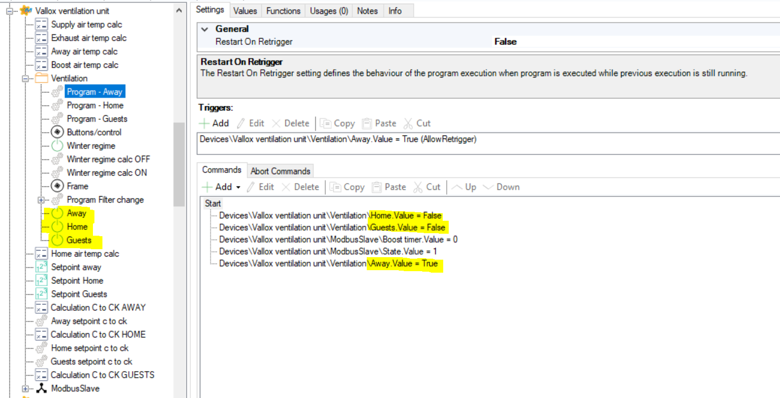 But heres how I've done it. For every mode you need to make a Boolean button (away, home, guests) Then make programs for them, trigger will be the same boolean mode button.