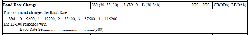 The baud rate can be changed by the application by sending a Baud Rate Change (080) command. The IT-100 responds with the Baud Rate