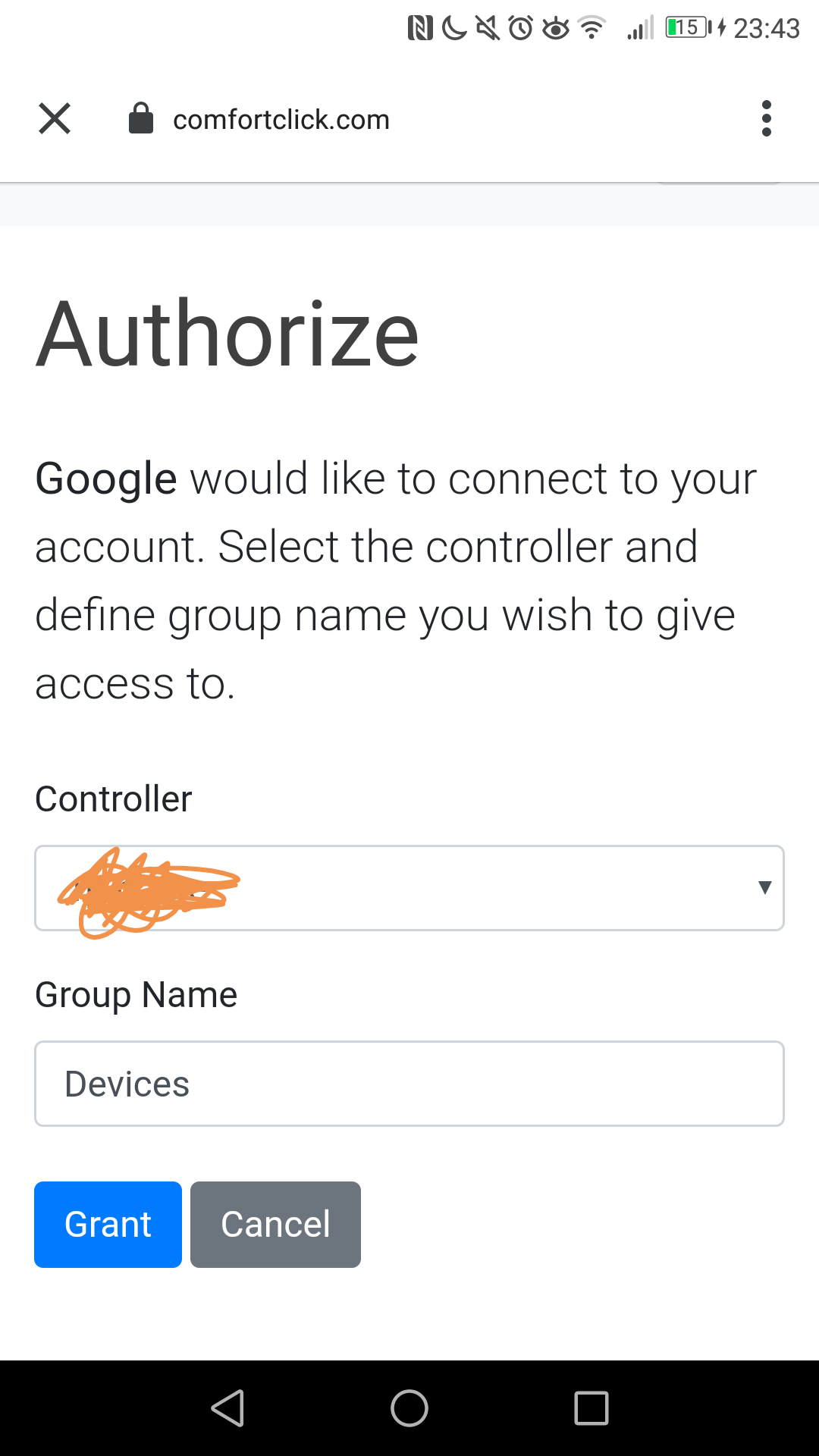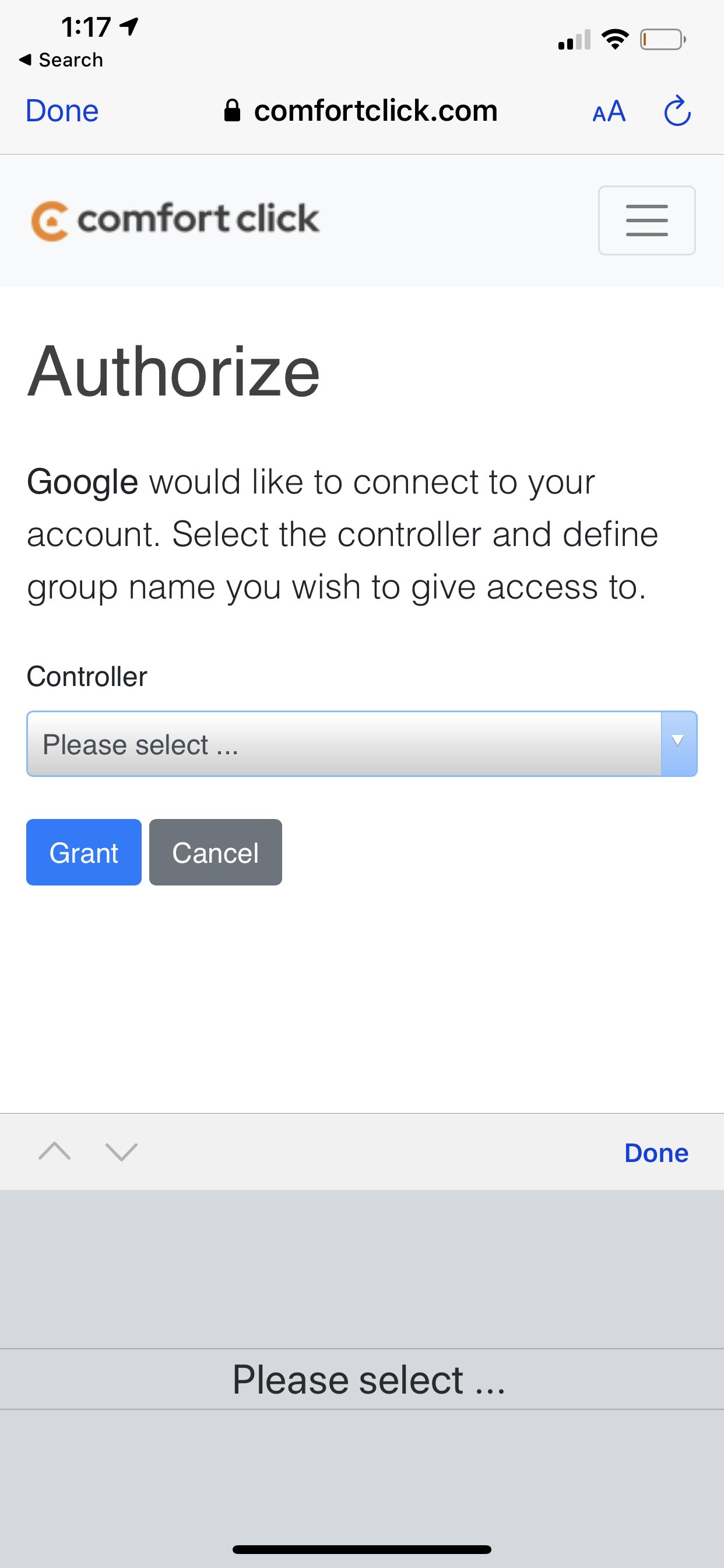 Hi when I try to connect google home to ComfortClick I get the following to authorise but there is not to select from The drop down